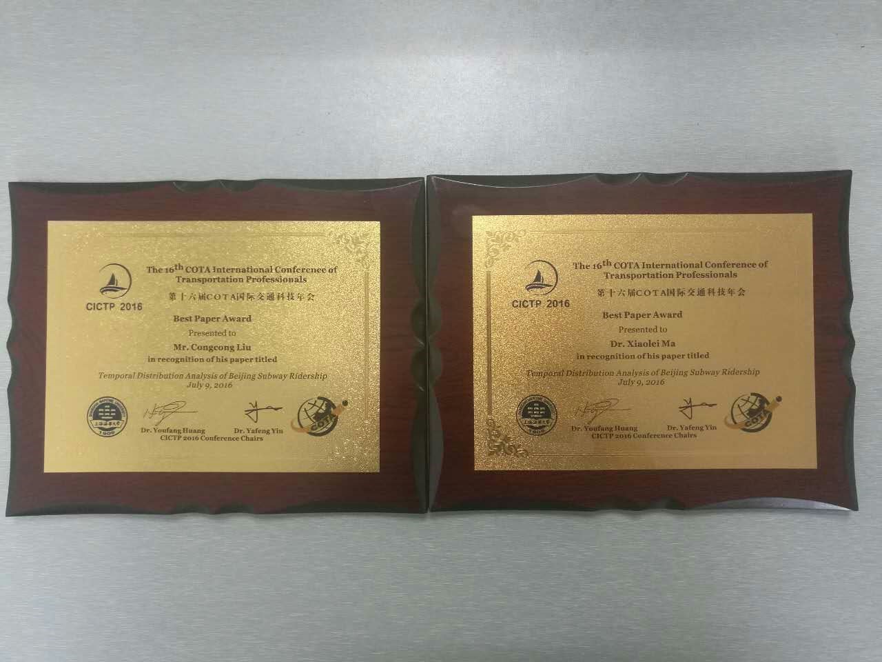 我院马晓磊副教授与其学生刘从从所投会议论文“Temporal Distribution Analysis of Beijing Subway Ridership”,经过大会层层评议和筛选,从500多篇论文中脱颖而出,荣获大会最佳论文奖,并邀请马晓磊副教授在会议做专题报告,并在闭幕式上隆重举行颁奖仪式。