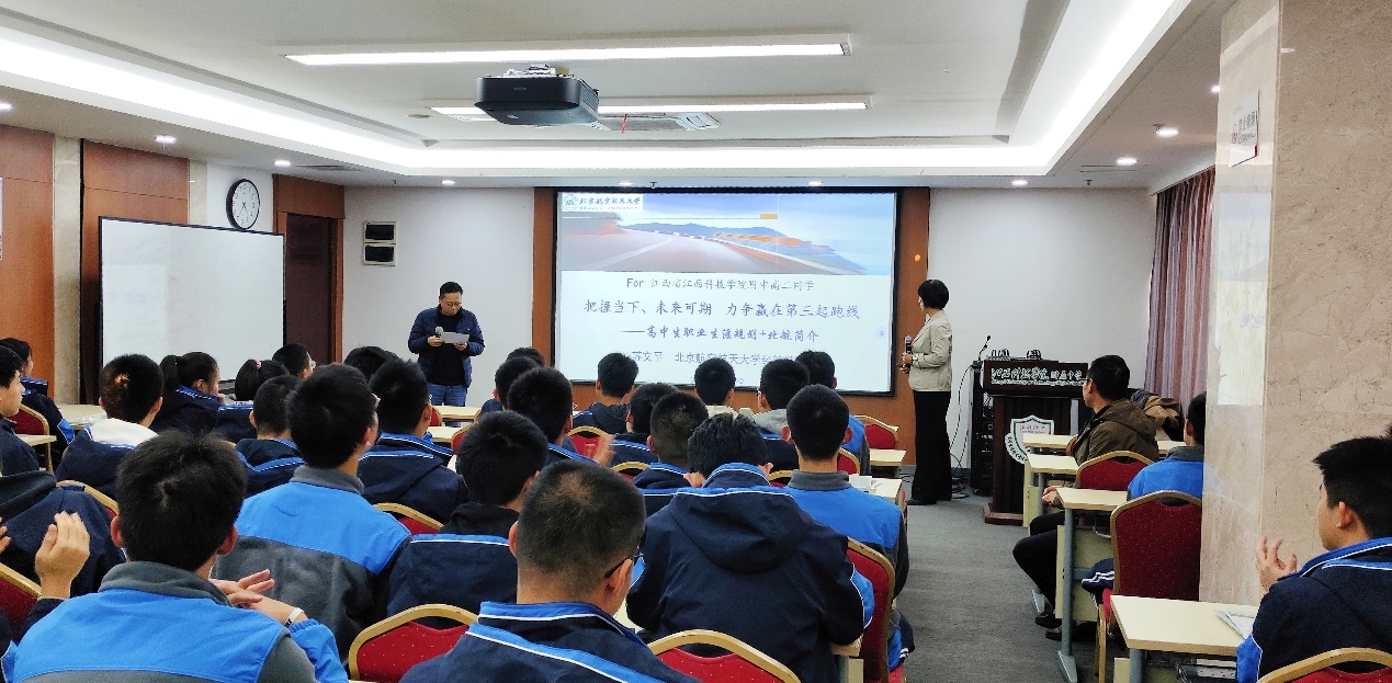 11月29日,招生组抵达江科附中,继续进行招生宣传与学术交流活动。苏文平教授为高二年级的学生们带来了以《把握当下,未来可期,力争赢在第三起跑线——高中生职业生涯规划与北航简介》为主题的讲座,讲座内容深入浅出,为学生们提供了科学的职业生涯规划路径,也激发了同学们对北航的兴趣。
