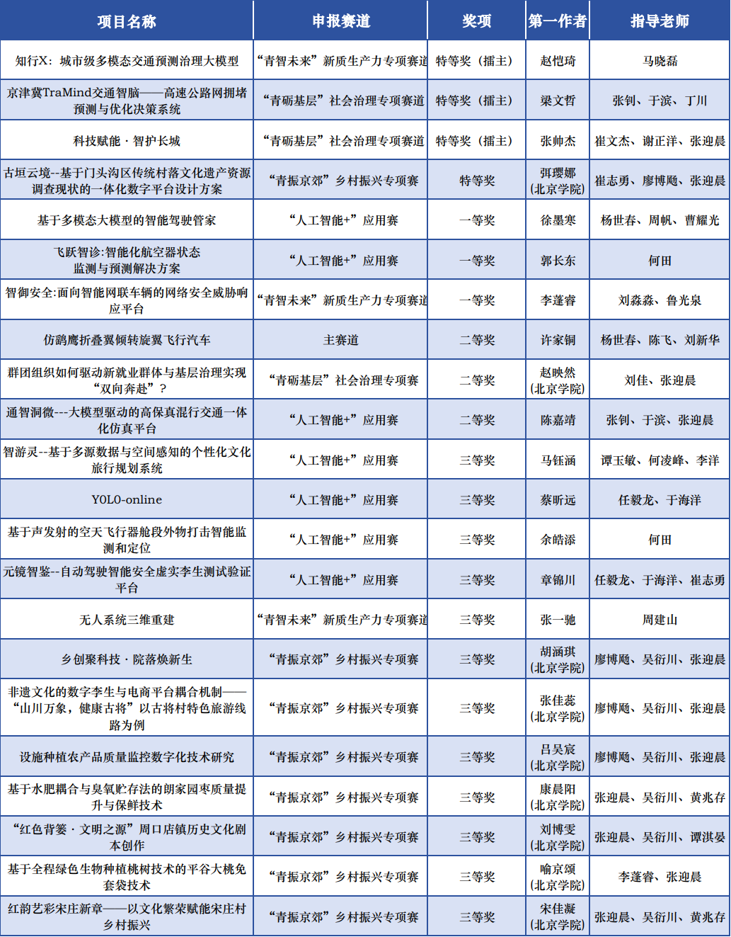 在本次大赛中,交通学院积极申报自主创新项目、悉心指导学生参赛团队,共斩获4项特等奖(其中3项为擂主项目)、3项一等奖、3项二等奖及12项三等奖。面对城市基层治理、乡村振兴发展与未来产业变革等复杂社会课题,我院参赛队伍紧贴时代脉搏,聚焦真问题、提出真方案,展现出青年学子服务社会、创新攻坚的使命担当。